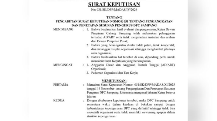 Umar Farouq Dicopot, DPP MADAS Bekukan DPC Sampang: Pelanggaran AD/ART Jadi Alasan Utama